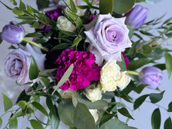 Our Collection No. 21 is designed with vibrant and beautiful shades of purple blooms and lush greenery, including roses, spray roses, carnations, and tulips with a mix of silver dollar eucalyptus and Italian ruscus.